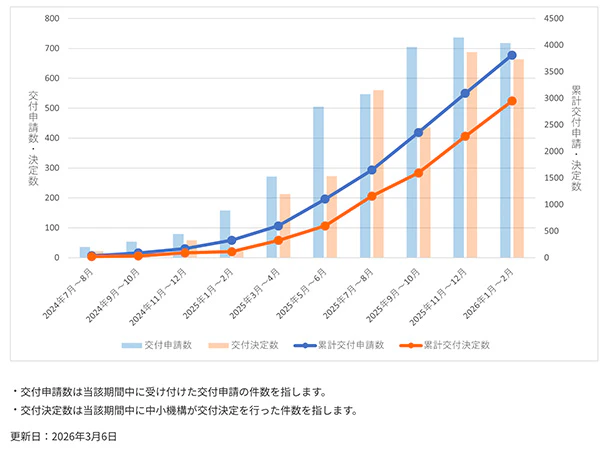 令和8年1月~2月は、交付申請数が700件超であるのに対し、交付決定数は700件弱となっています。このことから、同時期の交付決定率は高い水準にあると考えられます。