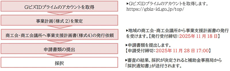 事業計画書(様式2)を作成し、地域の商工会・商工会議所へ「事業支援計画書(様式4)」の発行を依頼します。その後、申請書類一式を提出します。
